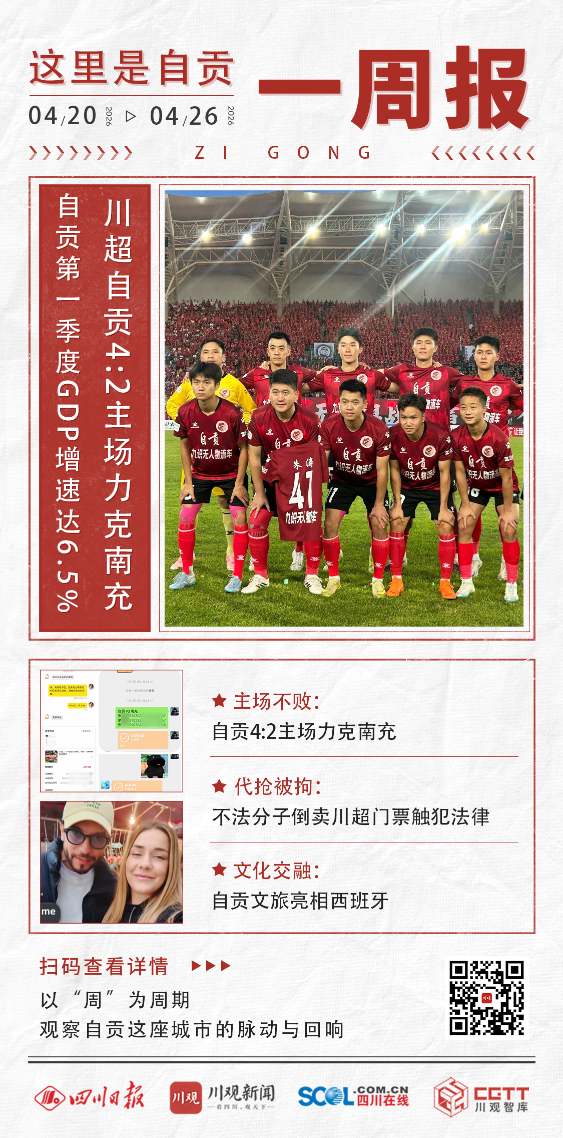 本周(4月20日—4月26日),2026 年自贡一季度 GDP 数据出炉,全市生产总值达 469.97 亿元、同比增长 6.5%,一二三产稳步增长,农业、工业发展态势向好;川超联赛赛场,自贡灯城燊龙队主场 4:2 击败南充丝绸源点队,守住主场不败战绩;与此同时,自贡文旅亮相西班牙巴塞罗那文旅活动,外籍网红博主现场分享自贡美食体验,助力盐都文旅走向海外;自贡队主场赛事备受广大球迷关注,却有不法分子趁机倒卖门票牟。近日在市局治安、网安支队的指导下,自贡高新公安再次查处一起代抢门票的案件。
