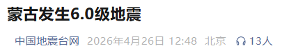 据中国地震台网正式测定,4月26日12时23分在蒙古发生6.0级地震,震源深度15公里,震中位于北纬46.85度,东经93.15度,距我国边境线最近约160公里。