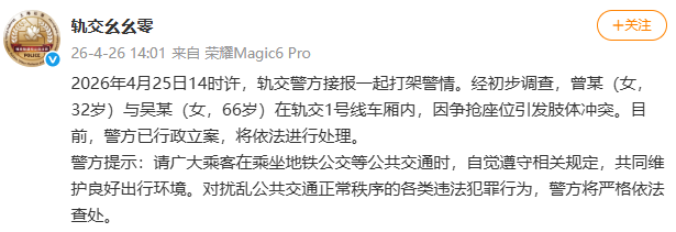 2026年4月25日14时许,轨交警方接报一起打架警情。经初步调查,曾某(女,32岁)与吴某(女,66岁)在轨交1号线车厢内,因争抢座位引发肢体冲突。目前,警方已行政立案,将依法进行处理。