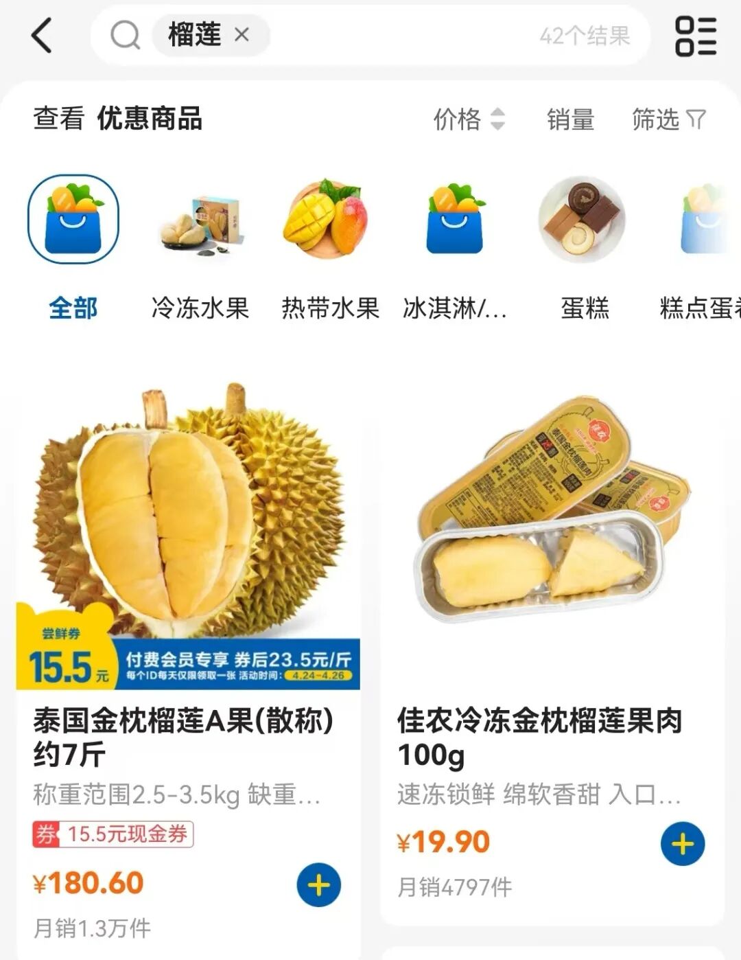 价格下降直接带动销量暴涨。益民菜市长顺街店店员说:“3月份整月才卖了几件榴莲,现在几天就要卖一件,是3月的好几倍。”京东相关负责人透露,进入4月下旬,平台榴莲销量环比增长超200%,不少店铺出现“补货中”的状态。