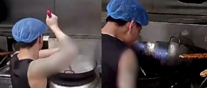 与另一家店共用明厨亮灶视频 另一视角可见扫把放入锅中