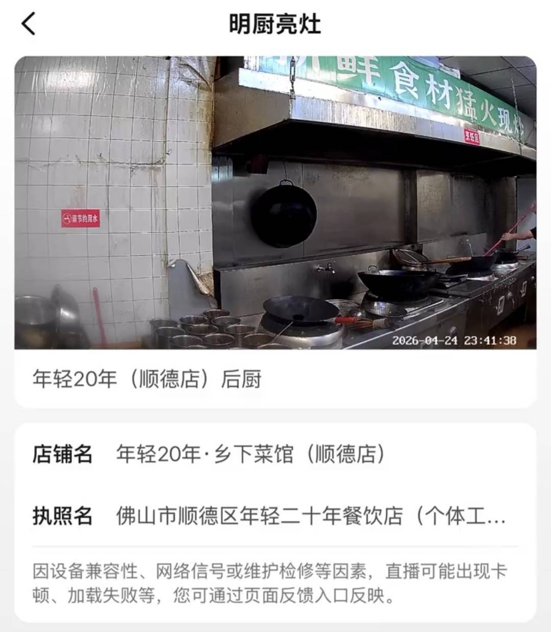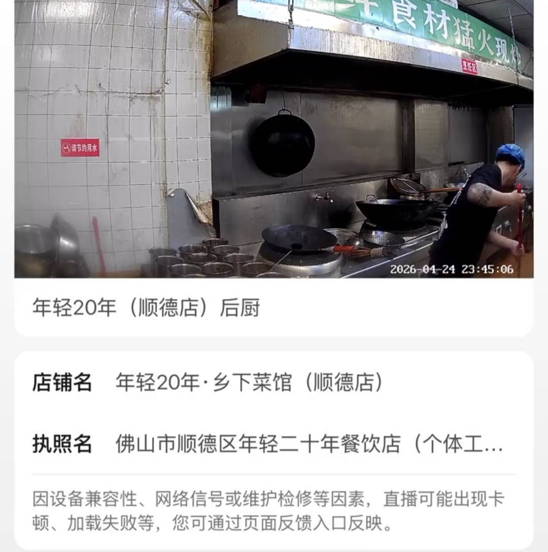冯先生告诉封面新闻记者,24日晚,他想吃宵夜,于是,便打开外卖平台寻找。他点进一家评分4.7分的“年轻20年·乡下菜馆(顺德店)”,因商家正好有“明厨亮灶”,他便点击进去。这是后厨的直播,此时,已经23点40左右,后厨工作人员正在做清洁。
