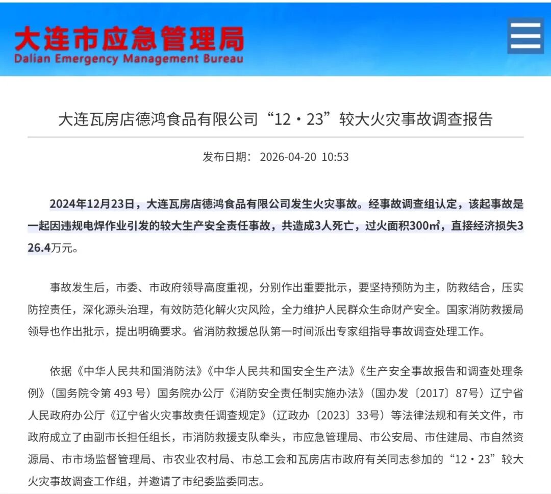 2024年12月23日,大连瓦房店德鸿食品有限公司发生火灾事故。经事故调查组认定,该起事故是一起因违规电焊作业引发的较大生产安全责任事故,共造成3人死亡,过火面积300㎡,直接经济损失326.4万元。