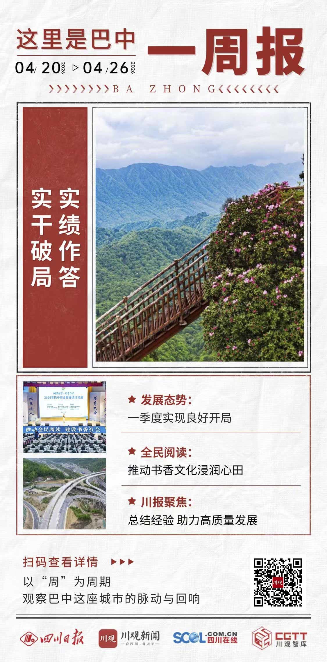 4月20日至26日,又一周时间过去。本周,巴中市20026年一季度经济运行数据亮眼出炉,全民阅读活动周和第十四届光雾山杜鹃花节相继启幕。此外,四川日报市州观察巴中版聚焦闲置低效资产资源盘活和虚拟电厂降本增效,展示巴中实干破局、实绩作答的经验做法。