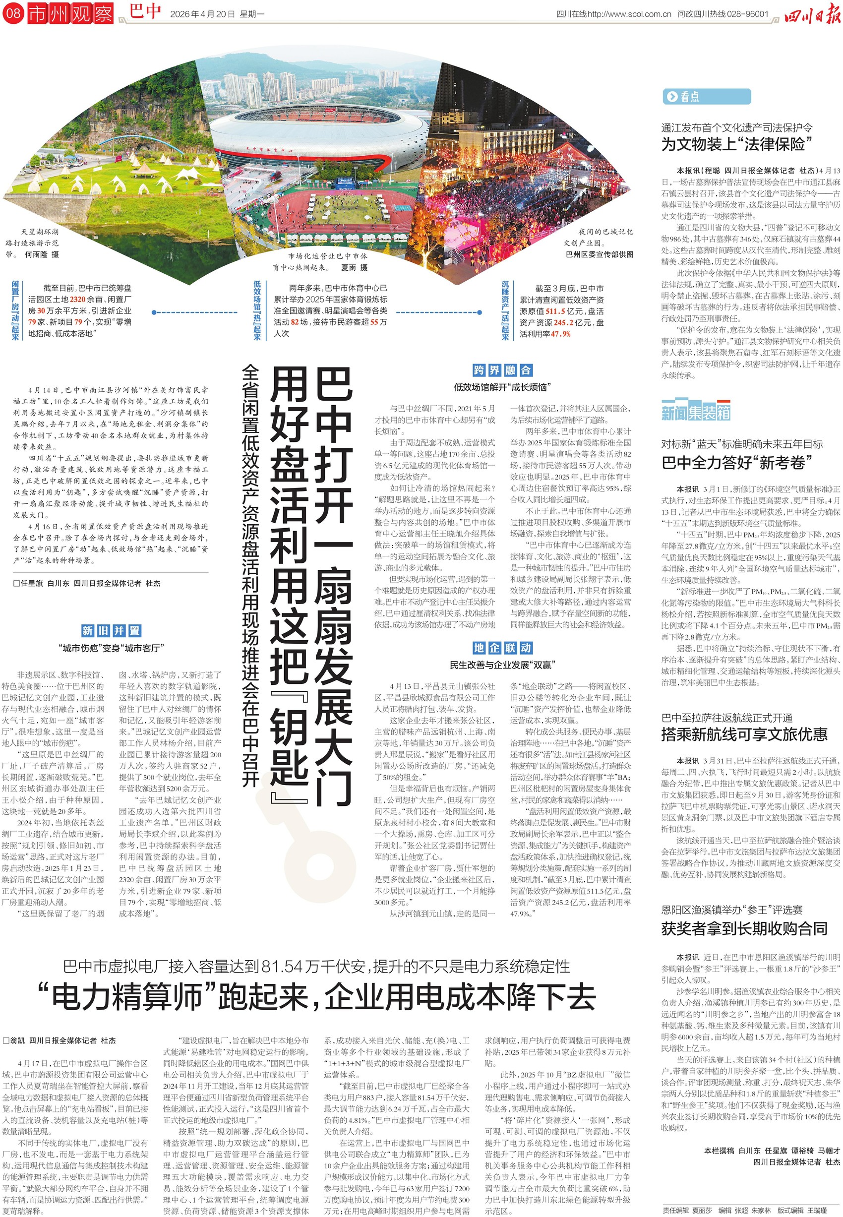 4月20日,本月的四川日报市州观察巴中版聚焦闲置低效资产资源盘活和虚拟电厂降本增效,将巴中的相关经验总结提炼推广开来。相关报道:市州观察巴中版