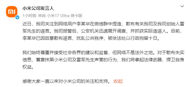 近日,小米公司关注到网络用户李某华在微信群中捏造、散布有关小米公司及小米创始人雷军先生的谣言。小米公司报警后,公安机关迅速展开调查,并抓获实际造谣人。目前,李某华已因故意散布谣言、扰乱公共秩序,被依法处以行政拘留十日。