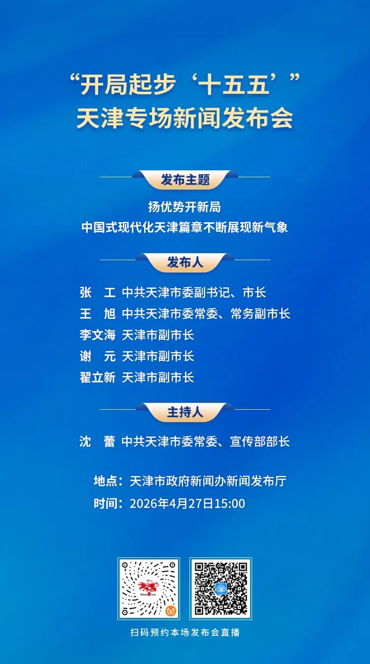 天津市政府新闻办将于4月27日(星期一)15:00,在市政府新闻办新闻发布厅举行“开局起步‘十五五’”天津专场新闻发布会,邀请中共天津市委副书记、市长张工,中共天津市委常委、常务副市长王旭,天津市副市长李文海,天津市副市长谢元,天津市副市长翟立新出席,围绕《天津市国民经济和社会发展第十五个五年规划纲要》,介绍天津未来五年经济社会发展目标和重点任务,并答记者问。