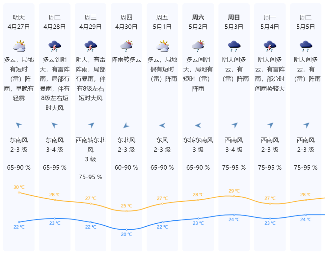 展望五一假期,1-2日多云间阴天,局地偶有短时(雷)阵雨;