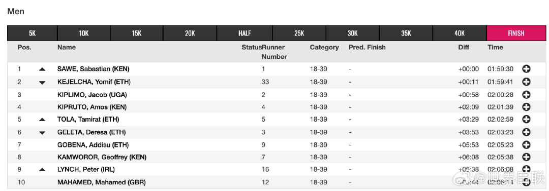 首次参加全马比赛的埃塞俄比亚选手科杰查1小时59分41秒冲线获得亚军,实现首马破2壮举,并创造首马纪录。