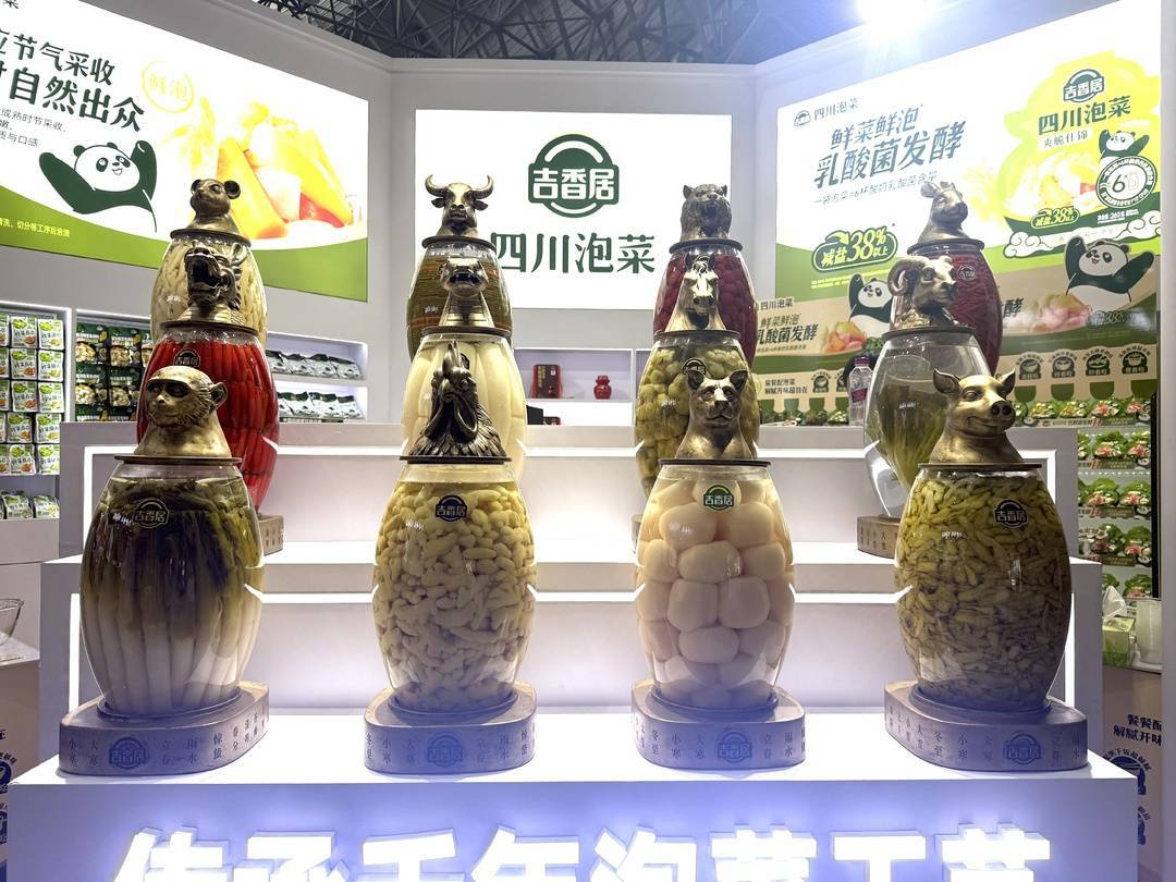 吉香居食品股份有限公司展柜前的十二生肖泡菜坛,让路过的游客纷纷停下来驻足、拍照、品尝。“吉香居的榨菜我从小就在吃,家乡的老味道了。”看到记者在询问,眉山市民陈洪林主动接过话茬。陈洪林在眉山经营一家调味品店,自从去年参加过泡博会后,他便对这一泡菜界的盛会念念不忘。“泡博会参展商很多,不仅可以尝到许多新口味的泡菜,也是一个对接厂商的好机会。”陈洪林说。