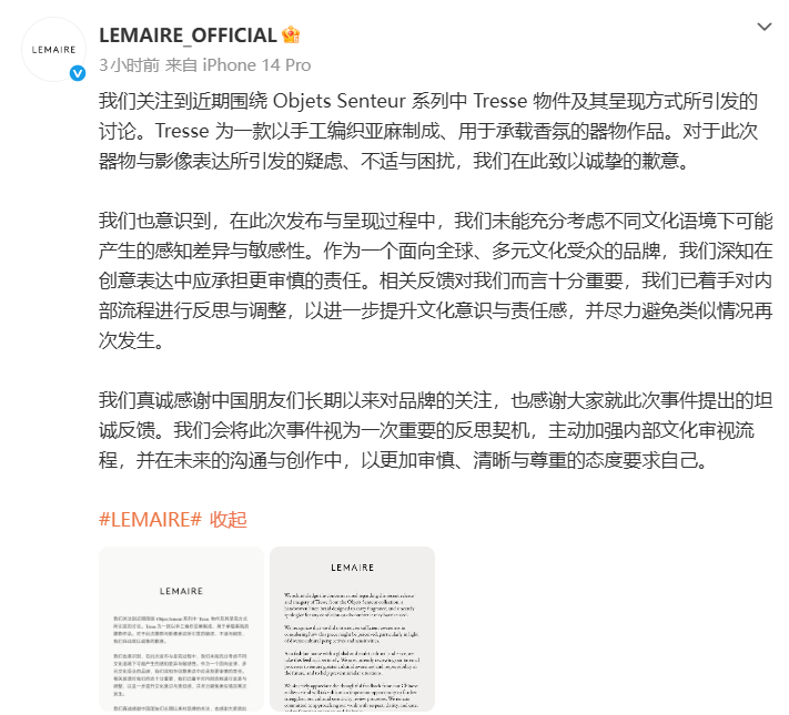 4月26日,@LEMAIRE_OFFICIAL 发文致歉: