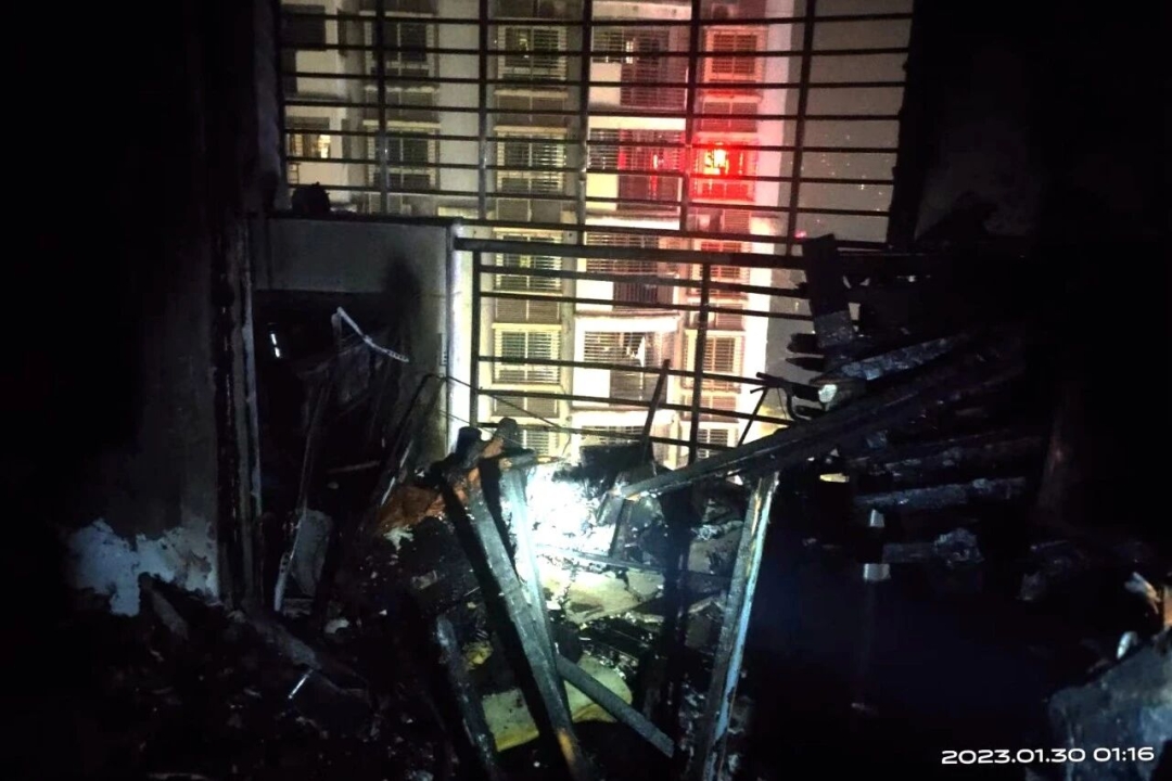 当时邻居燃放的烟花火星飞入阳台