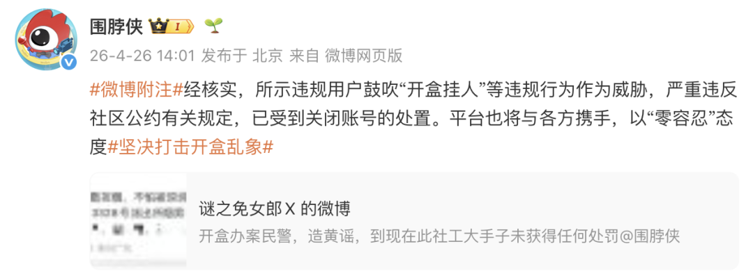 4月26日下午,微博社区观察员官方账号@围脖侠 回应:“经核实,所示违规用户鼓吹‘开盒挂人’等违规行为作为威胁,严重违反社区公约有关规定,已受到关闭账号的处置。平台也将与各方携手,以‘零容忍’态度坚决打击开盒乱象。”