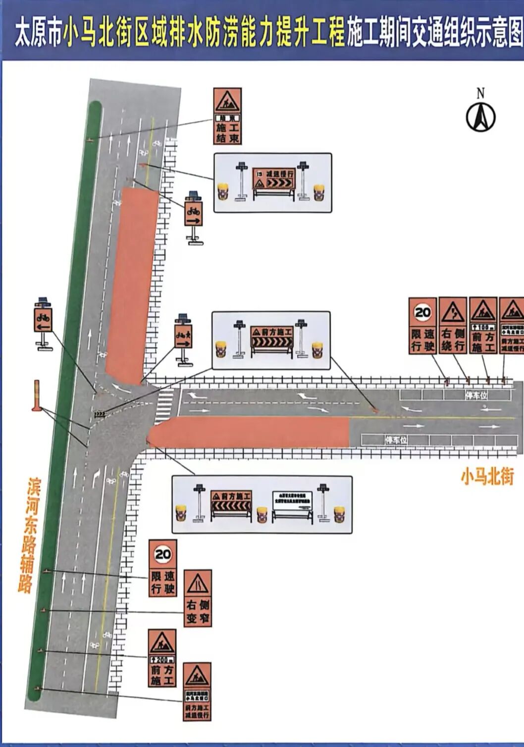 为有效解决东沺一(二)巷及周边道路排水不畅、汛期内涝等问题,2026年4月26日零时至7月6日零时将占用太原市小马北街与滨河东路辅路进行排水管网接入晋阳街泵站施工,施工期间小马北街半幅封闭,半幅双向通行,与之相交的滨河东路东侧的一条辅路同时进行封闭作业,施工带来不便,请广大市民予以理解与支持。