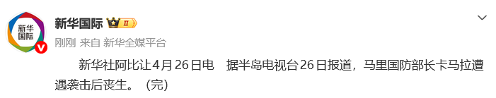 据新华社援引半岛电视台26日报道,马里国防部长卡马拉遭遇袭击后丧生。