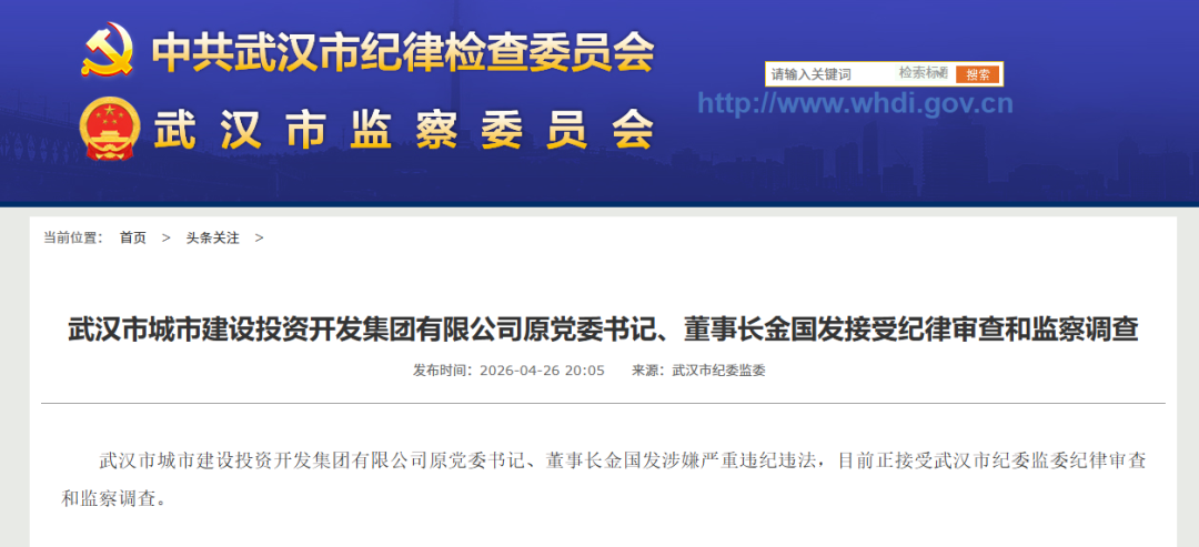 武汉市城市建设投资开发集团有限公司原党委书记、董事长金国发涉嫌严重违纪违法,目前正接受武汉市纪委监委纪律审查和监察调查。