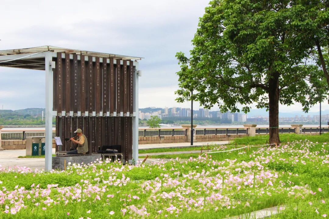 粉白花海沿步道蜿蜒铺开,与江畔绿意、粼粼波光相映成趣,绘就一幅春日画卷,吸引众多市民前来踏青赏花、定格美好。