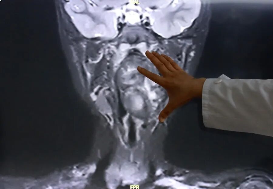 专家表示,该肿瘤紧邻颈内动静脉并将血管明显向外推移,肿瘤向咽喉腔内隆起,占据大部分口咽及下咽腔,严重压迫声门,随时可能发生窒息。