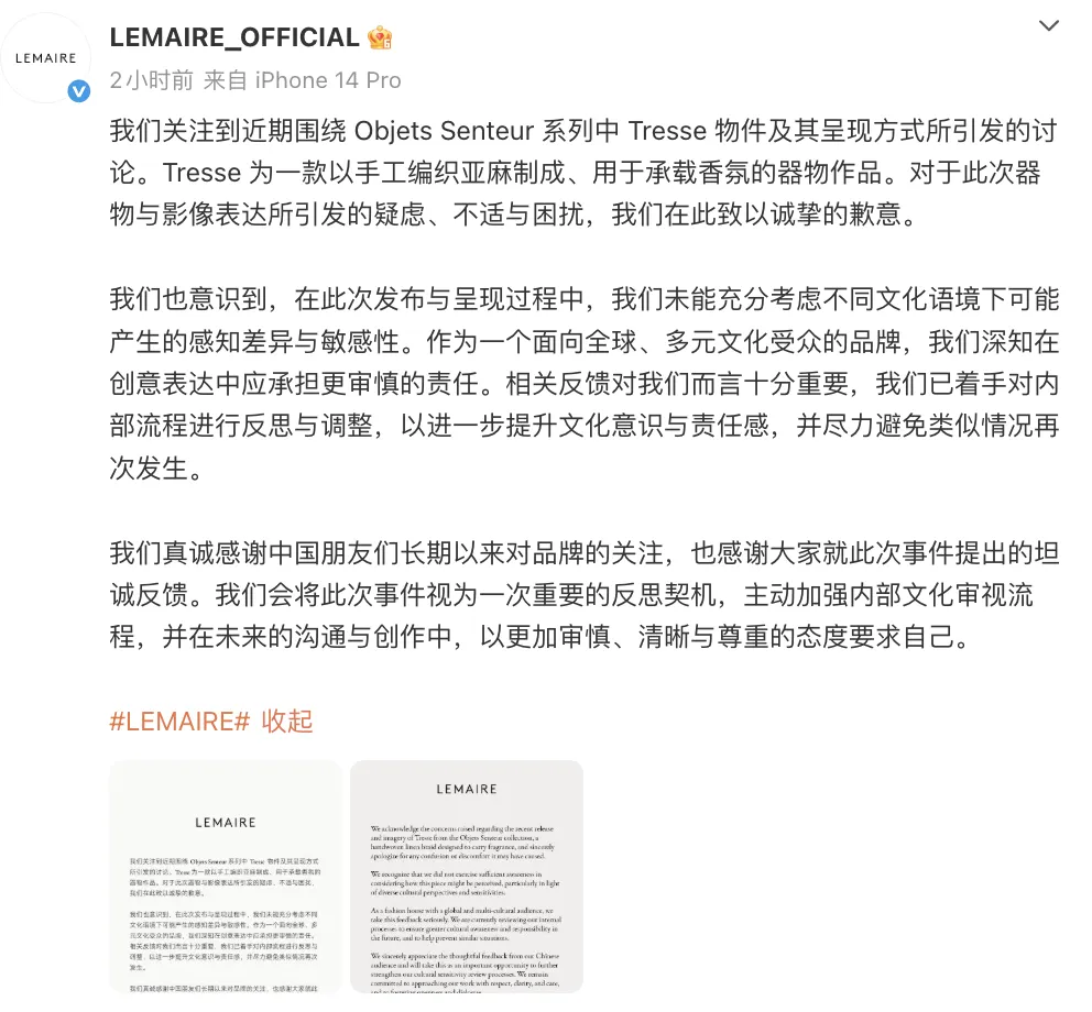 4月26日,@LEMAIRE_OFFICIAL 发文致歉: