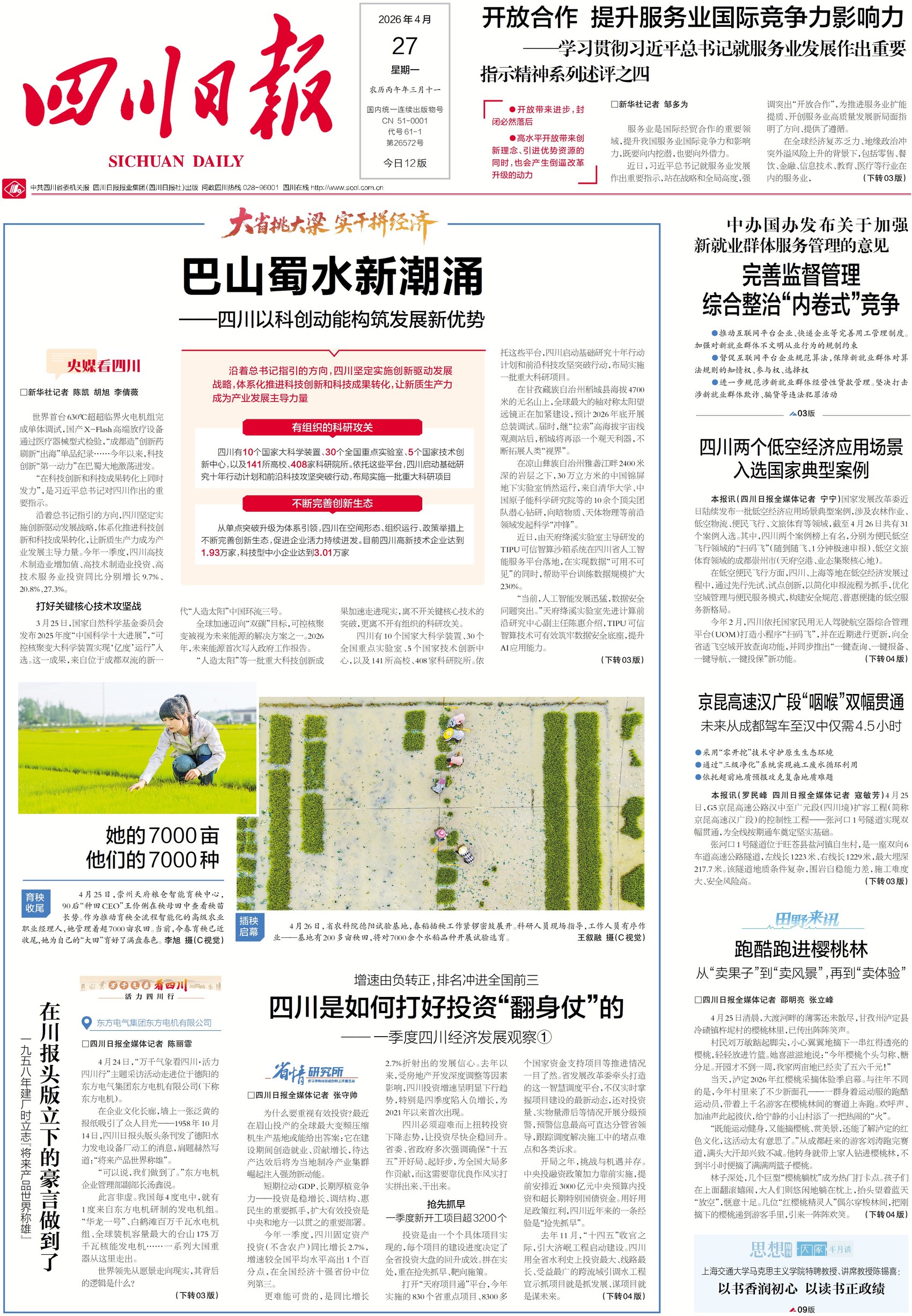 今年一季度,四川固定资产投资同比增长2.7%,增速高于全国平均水平,实现由负转正。通过抢先抓早推进项目开工,一季度新开工项目超3200个,部分重点项目提前开工,同时精准发力优化投资结构,高技术制造业、绿色低碳优势产业投资高速增长,还以贴心服务强化全生命周期保障,推动民间投资增长。关注一版,看四川如何打好投资翻身仗。