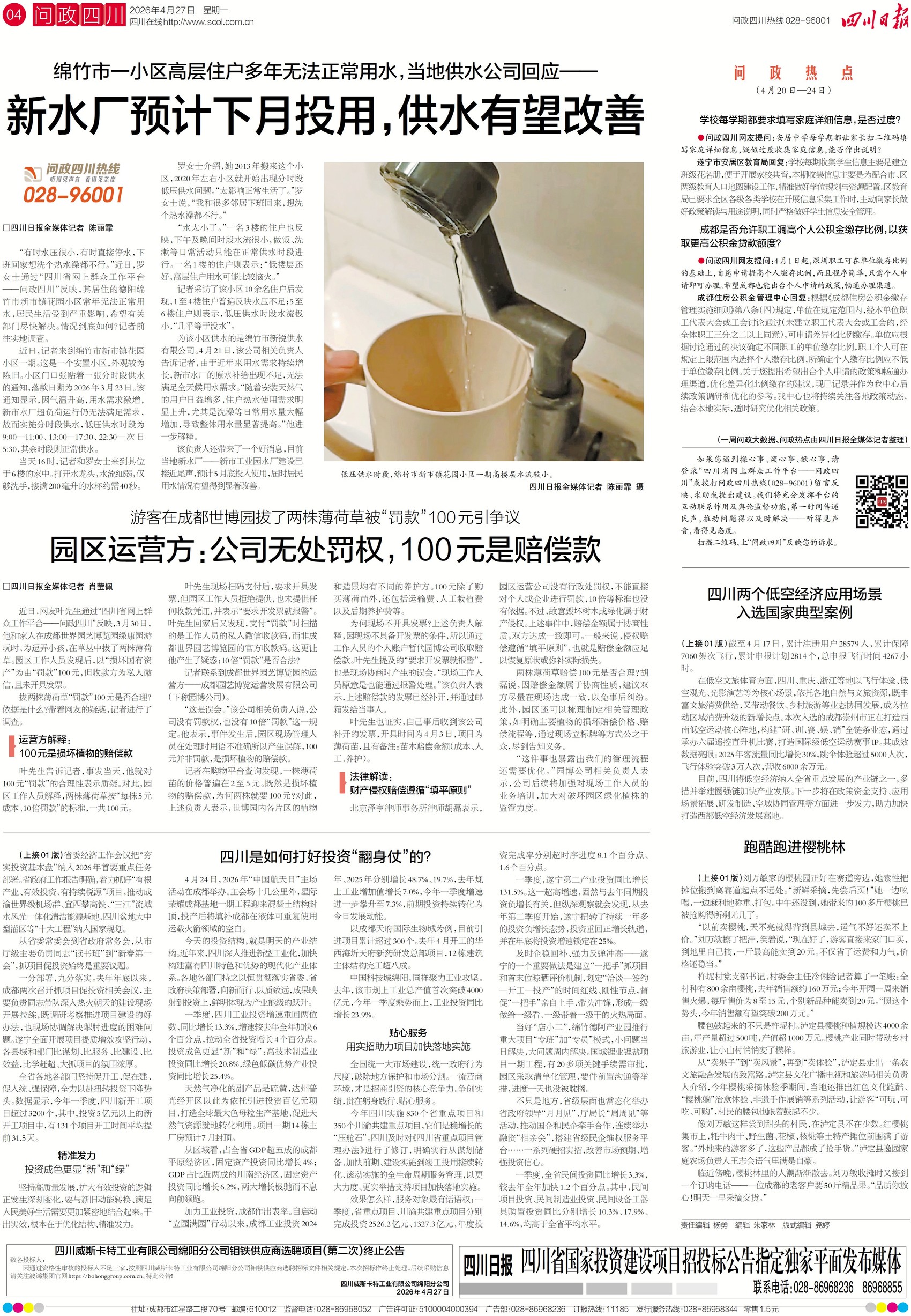 近日,德阳绵竹市民反映,所在小区常年水压不稳,且分时段低压供水,下班想舒舒服服洗个澡都成奢望,严重影响日常生活。记者实地调查了解到,根源是老旧水厂负荷超标、供水跟不上激增的用水需求。不过,当地新建水厂5月底就能投用,用水难题很快将得到缓解。关注四版,了解详情。