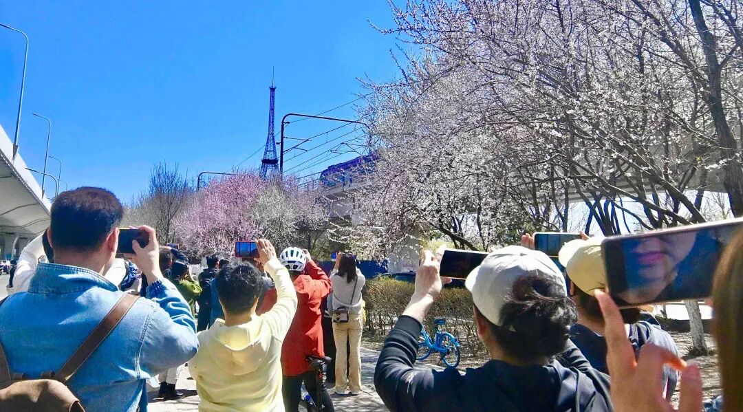 站在快速路桥下朝东南方向望去,一幅层次丰富的城市画卷在眼前展开——近处桃花、杏花绽满枝头,粉白相映;稍远处,轻轨列车快速驶过;背景中一座铁塔静静伫立,与烂漫花枝、流动的列车构成恰到好处的景深。这幅被市民称为“长春春日明信片”的画面,近日在社交媒体上爆火,每天吸引大批市民与游客专程前来,寻找最佳机位,记录这场不期而遇的城市浪漫。