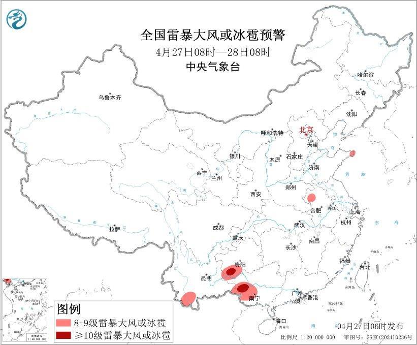 预计4月27日08时至28日08时,黄淮地区东部和西南部、西南地区南部、华南地区西部等地的部分地区将有8级以上雷暴大风或冰雹天气,其中,贵州西南部、广西西部等地的部分地区将有10级以上雷暴大风,最大风力可达11级以上;黄淮地区西南部、西南地区东部和西南部、江南地区西部、华南地区中西部等地的部分地区将有小时雨量大于20毫米的短时强降水天气,其中,湖南东部和西南部、广西北部等地的部分地区小时雨量大于50毫米,最大可达60毫米以上。