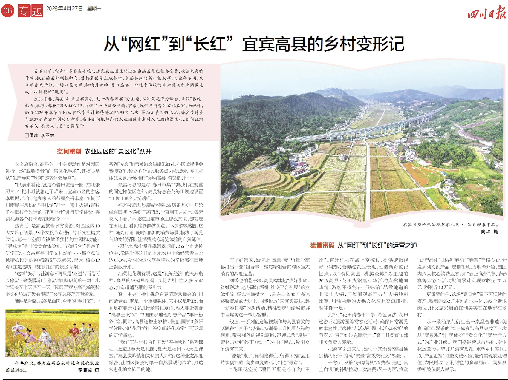 2026年春,高县以“来宜宾高县,赴一场春日宴”为主题,以油菜花海为舞台,串联“春晚、春酒、春茶、春花”四大核心IP,打造了一场融合非遗、赏景、民俗与消费的文旅盛宴。据统计,高县2026年春节期间及赏花季累计接待游客56.95万人次,带动消费2.85亿元,游客接待量与旅游消费额均创历史新高。高县如何把静态的农业园区变成引人入胜的景区?又如何让游客不仅“愿意来”,更“舍得花”?