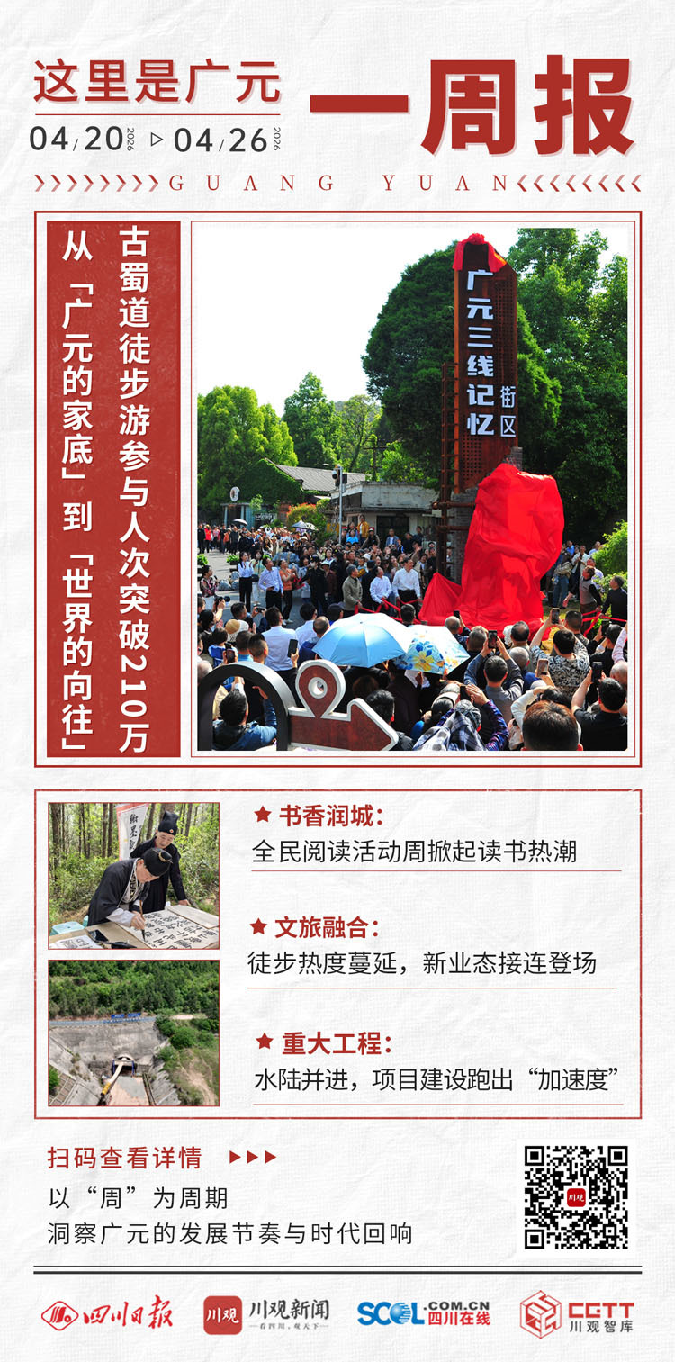 这一周里(4月20日至4月26日),广元文化文旅领域亮点频出,全民阅读活动周浸润城市文脉,古蜀道徒步游唤醒千年底蕴,三线记忆街区全新开街焕发城市新机,丰富多元的文旅业态持续扩容升级,不断擦亮广元城市名片。与此同时,基础设施建设全速提速、蓄力赋能高质量发展,水利工程攻坚收官、高速项目智能提质、重点项目审批提速增效,以坚实基建底盘筑牢城市发展根基。