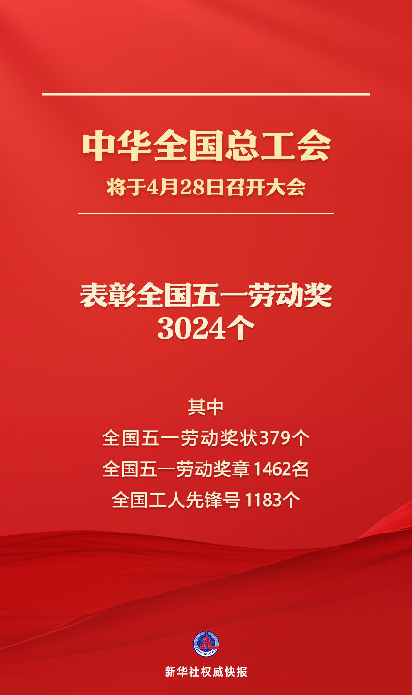 “五一”国际劳动节即将到来。记者4月27日从中华全国总工会获悉,全国总工会将于4月28日召开庆祝“五一”国际劳动节暨全国五一劳动奖表彰大会,届时将表彰全国五一劳动奖3024个,其中全国五一劳动奖状379个、全国五一劳动奖章1462名、全国工人先锋号1183个。