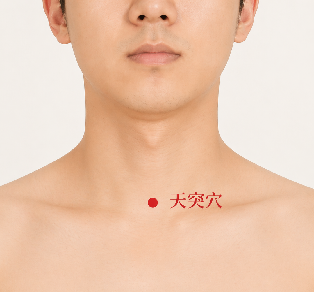 脖子正中间,两锁骨中间的凹陷处(胸骨上窝中央),就是天突穴。