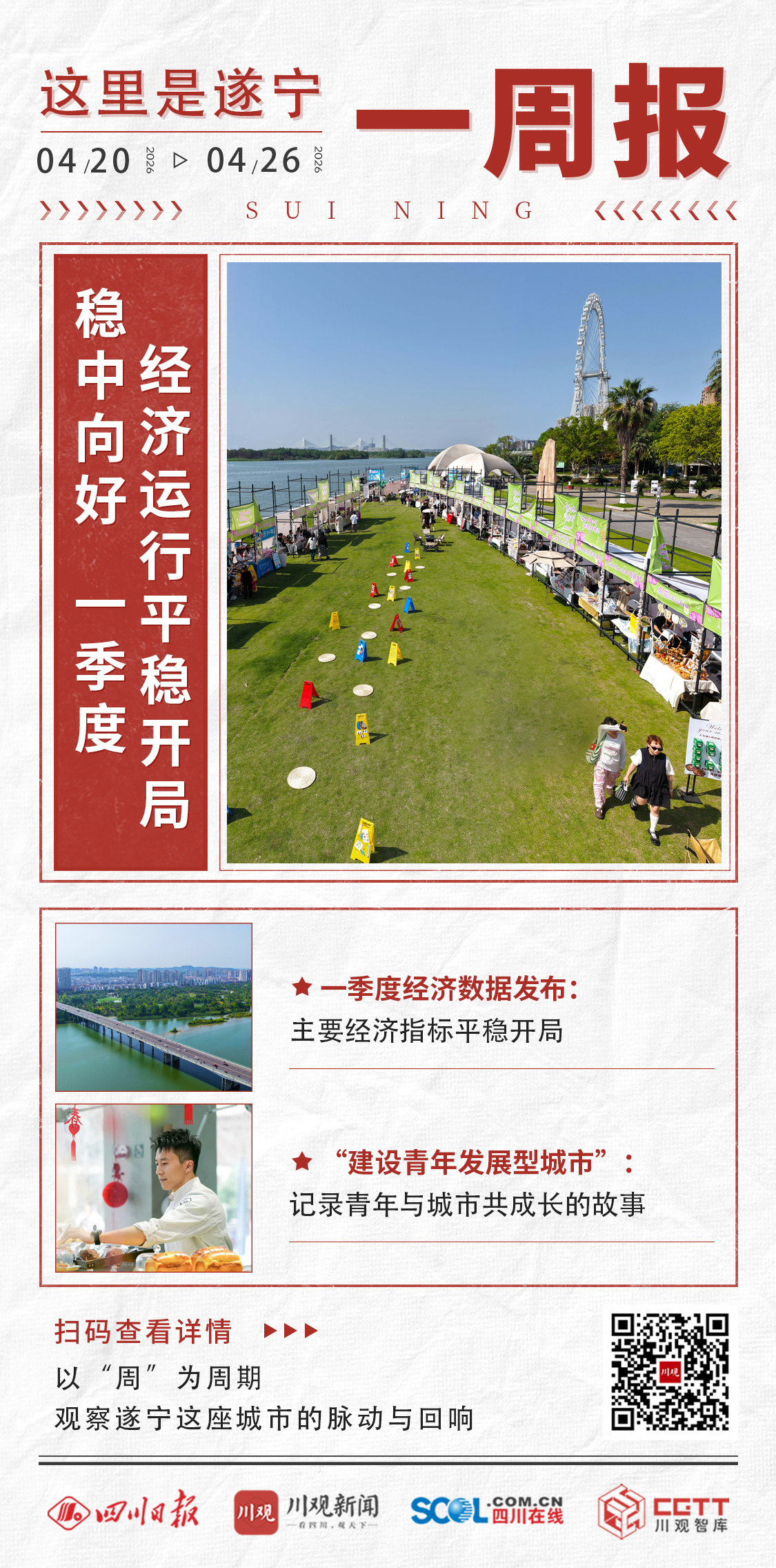 4月20日至26日,遂宁发布一季度经济数据。GDP同比增长6.1%,一系列数据显示第一季度全市经济运行延续稳中向好的发展态势,主要经济指标实现平稳开局。与此同时,川观新闻遂宁频道继续推出“建设青年发展型城市”系列报道,关注这座城市的青年创业人才,青年与城市共成长的故事。