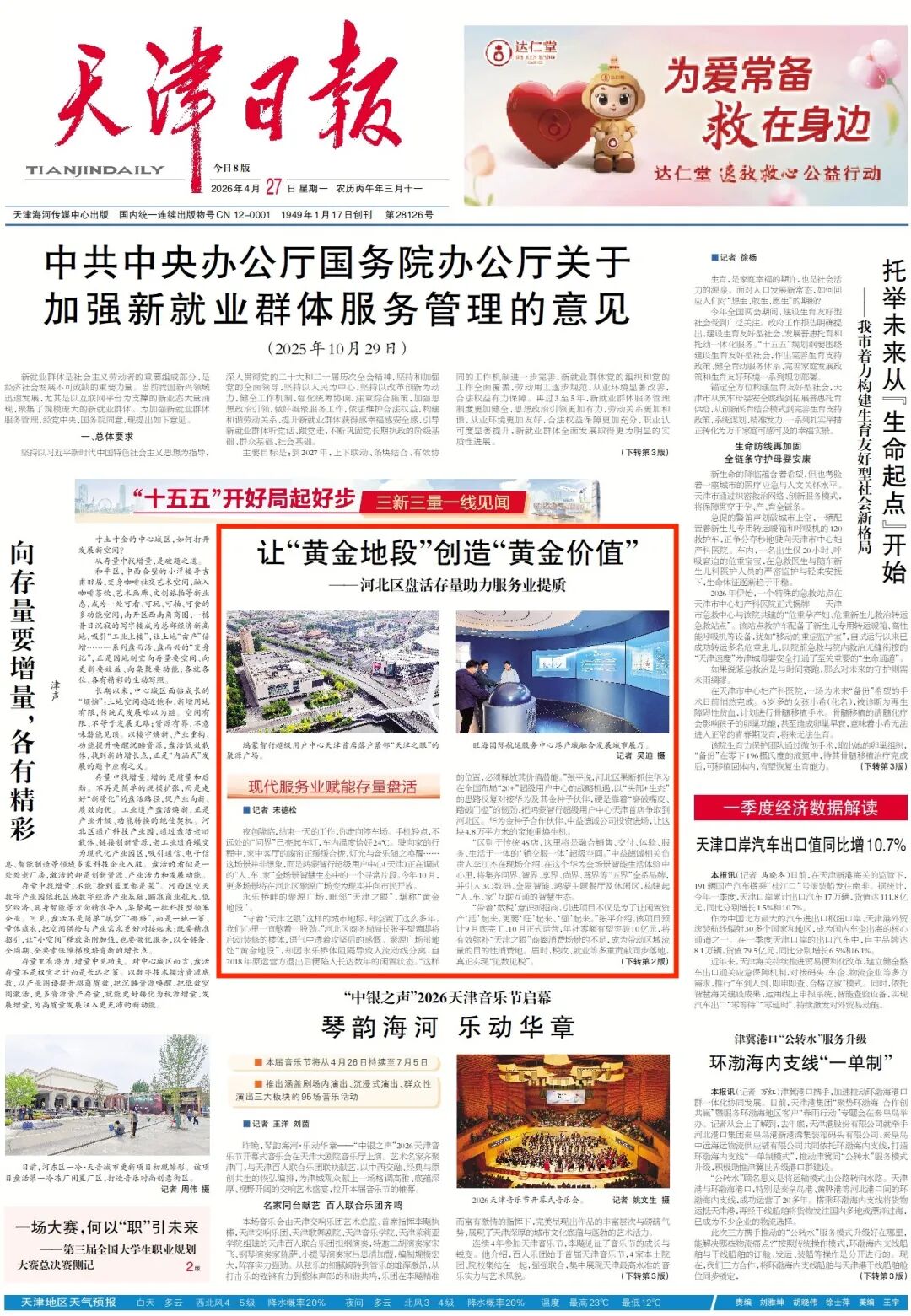 “盘活之路不同,内在逻辑相通。存量是载体,服务业是引擎,二者互为支撑。以优质存量承载服务业功能跃迁,以现代服务业赋能存量资产价值倍增,让‘黄金地段’创造‘黄金价值’。”河北区相关负责人说,全区正沿着服务业路线图,全力打造数字服务、航运服务、商贸文旅三大升级版:深耕华为与国网生态,用数字经济提效赋能;依托旺海国际与远洋大厦片区,做强船舶运力与航运科技;焕新“天津之眼”与意风区商圈,让生活性服务业在“一刻钟便民生活圈”里更有烟火气、便利度。