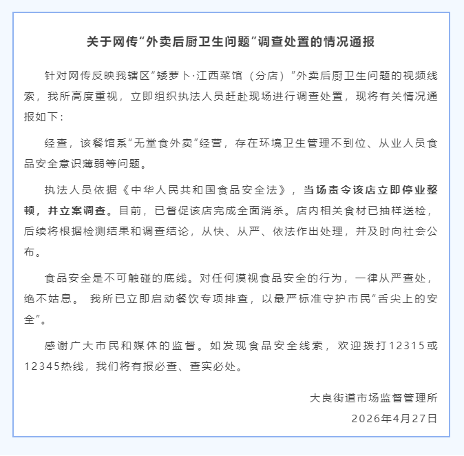 针对网传反映我辖区“矮萝卜·江西菜馆(分店)”外卖后厨卫生问题的视频线索,我所高度重视,立即组织执法人员赶赴现场进行调查处置,现将有关情况通报如下: