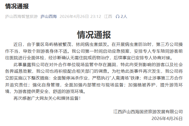 4月26日深夜,江西庐山西海国资旅游发展有限公司发布情况通报,近日,由于景区岛屿植被繁茂,林间病虫害频发。在开展病虫害防治时,第三方公司操作不当,导致个别游客身体不适。我公司第一时间启动应急预案,安排专人专车陪同游客前往医院进行全面体检,经诊断确认无需住院或药物治疗,后续事宜已安排专人协商对接。