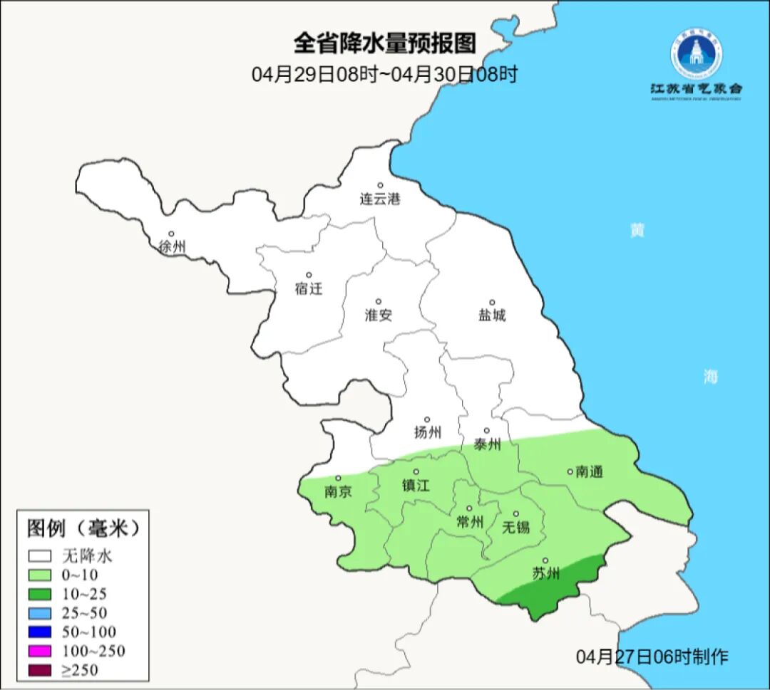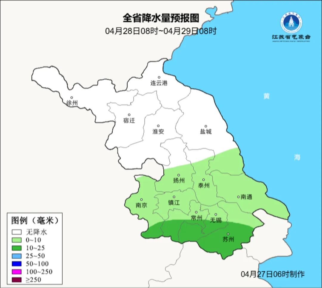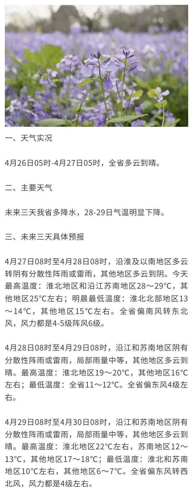 4月27日08时至4月28日08时,沿淮及以南地区多云转阴有分散性阵雨或雷雨,其他地区多云到阴。今天最高温度:淮北地区和沿江苏南地区28~29℃,其他地区25℃左右;明晨最低温度:淮北北部地区13~14℃,其他地区15℃左右。全省偏南风转东北风,风力都是4-5级阵风6级。