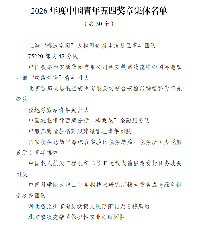 2026年度中国青年五四奖章暨新时代青年先锋奖评选结果揭晓。为表彰先进、树立典型,集中展示新时代中国青年的精神品格和价值追求,共青团中央、全国青联决定,授予支德源等29名同志中国青年五四奖章,授予上海“模速空间”大模型创新生态社区青年团队等30个青年集体中国青年五四奖章集体,授予刁新宇等749名同志新时代青年先锋。