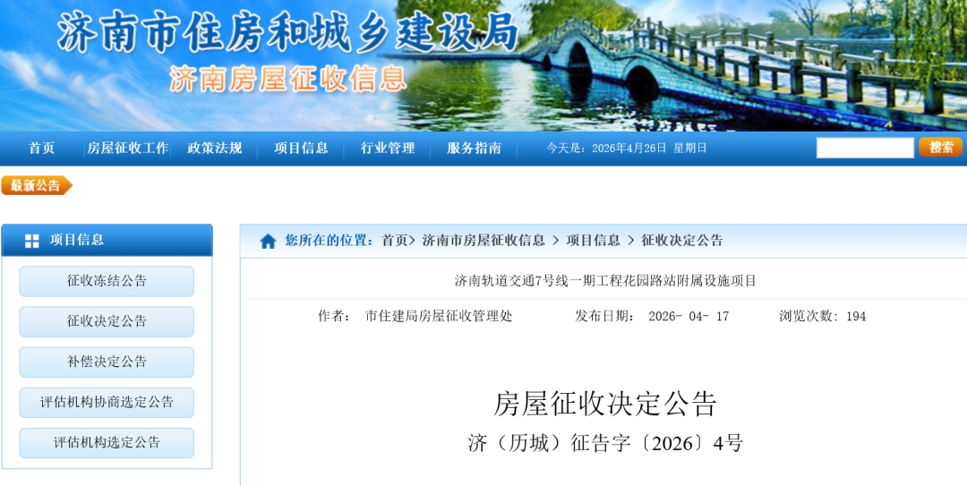 近日,济南市住房和城乡建设局发布征收决定公告,对济南轨道交通7号线一期工程花园路站附属设施项目国有土地上的房屋实施征收,项目征收范围确定,征收补偿方案公布。