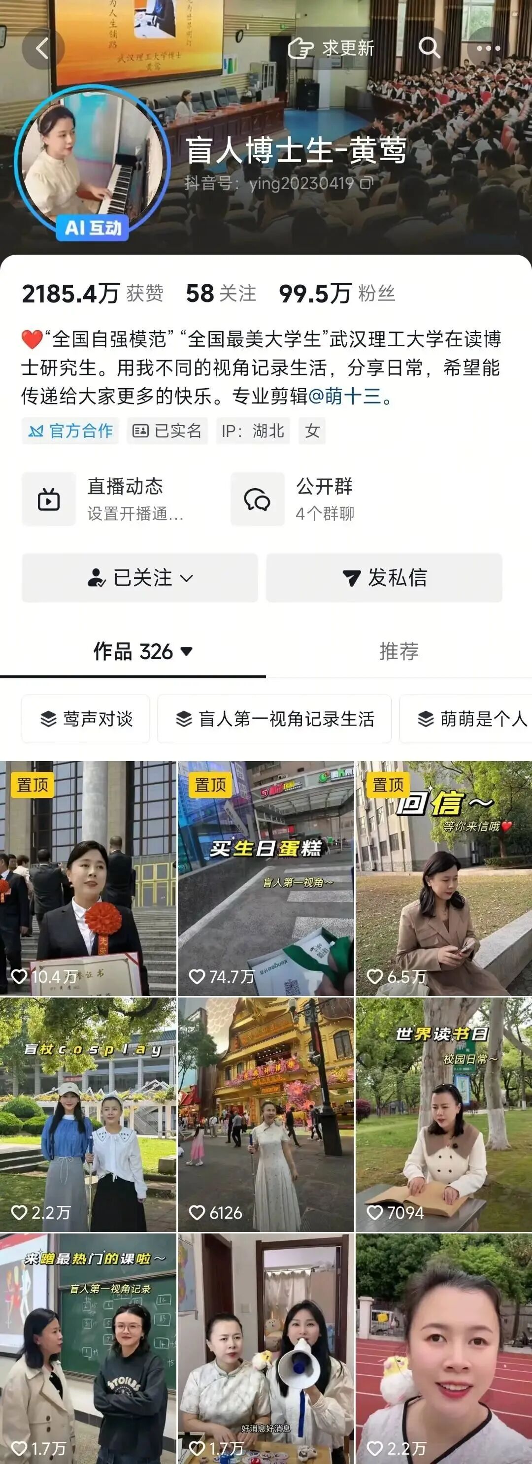她2岁失明,20岁成为全国第一个通过普通高考考上211大学的盲人,27岁时又考上博士。学业之余,她热心公益,用自身经历鼓励更多残障群体勇敢追梦,自媒体账号视频总播放量达到28亿余次——她是武汉理工大学管理科学与工程专业2022级博士研究生黄莺。