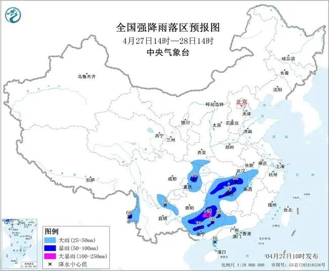 中国气象局启动重大气象灾害(大风、强对流、暴雨)Ⅳ级应急响应的命令:预计4月27日至28日,内蒙古中西部、山西东北部、河北北部和西部、北京、天津、辽宁中西部、山东东部等地部分地区有6~8级风,阵风8~10级,局地阵风可达11级以上;黄淮地区东部和西南部、西南地区南部、华南地区西部等地的部分地区将有8级以上雷暴大风或冰雹天气;重庆中部、贵州东部和南部、湖南中北部和西部、湖北南部和东部、广西北部、西部和东南部等地部分地区有大到暴雨。中央气象台已发布大风黄色预警,强对流、暴雨蓝色预警。