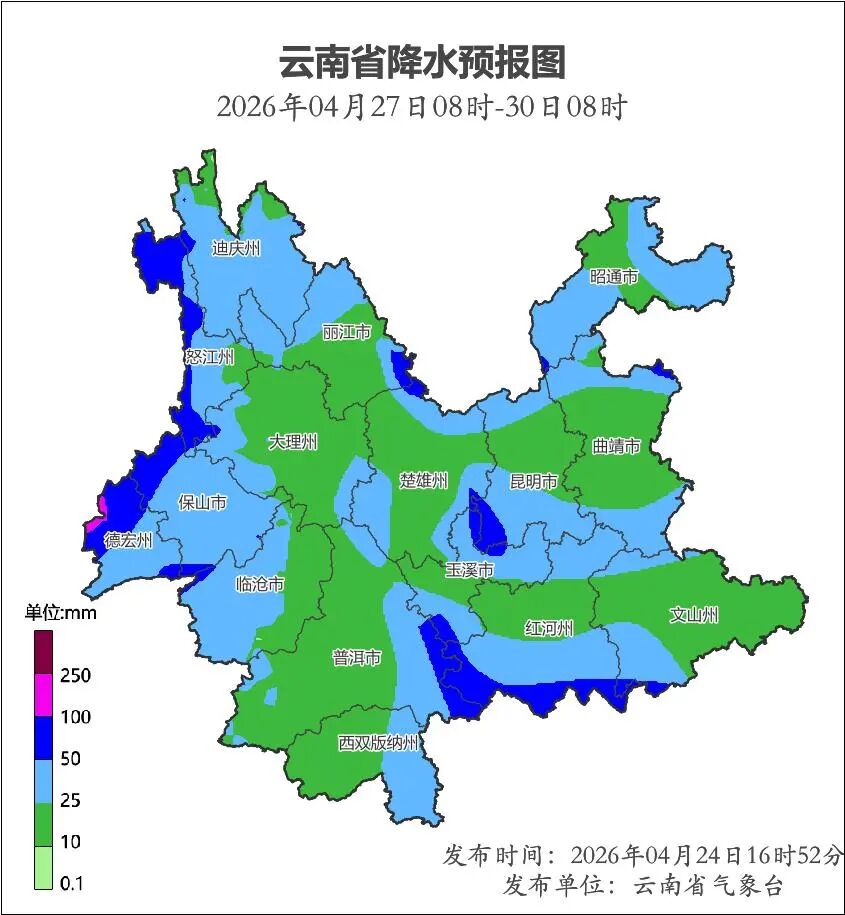 4月27日:昭通市、曲靖市、昆明市北部和东部、怒江州南部、保山市中西部、德宏州、临沧市西部、红河州西南部阴有中雨局部大雨、暴雨,其他地区多云有阵雨局部中雨。