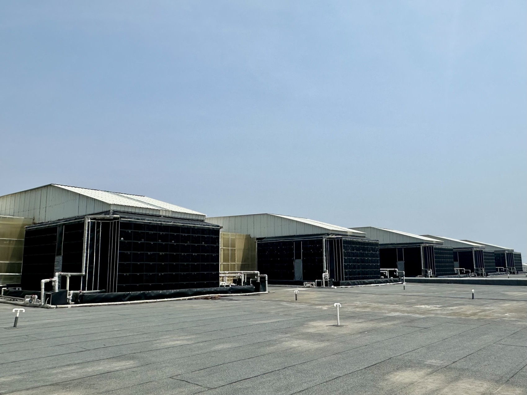 楼顶出风口配套灭菌除臭系统。猪舍排风经过除尘、氧化、灭菌处理后排出,减少对环境的影响。何璇 摄