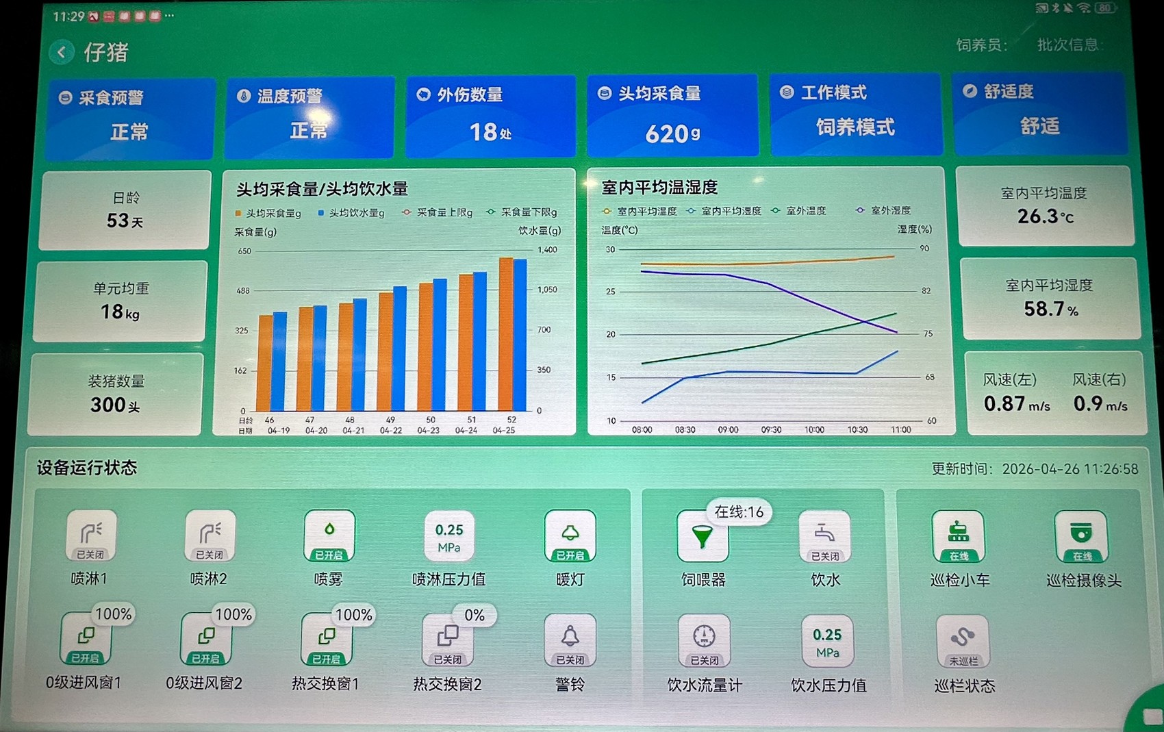 猪舍内,智能环控、智能饲喂、智能巡检等系统持续运行。温湿度、采食量、设备状态等数据在管理平台上实时显示;饲料通过管道输送到各楼层饲喂端,并根据猪只日龄、体重动态调整投喂。过去,养猪更多依赖经验;如今,数据、设备和系统正在成为新的管理工具。