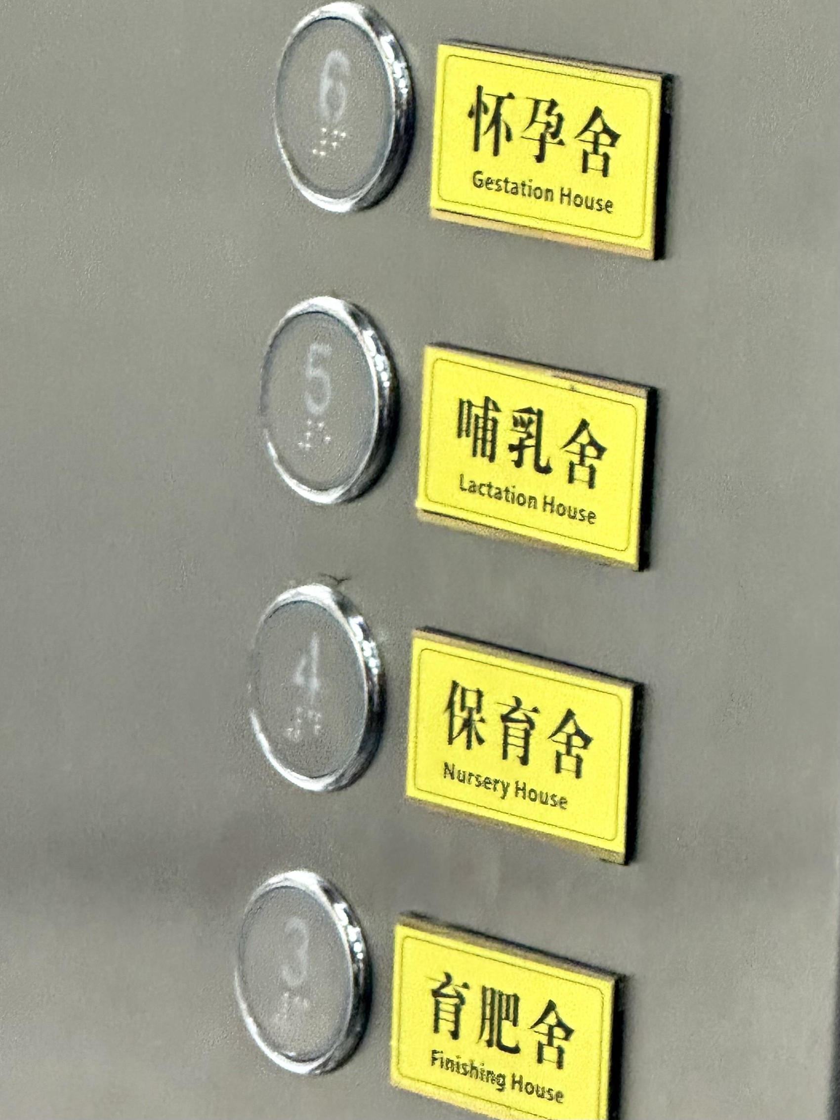 4月26日,记者走进河南省南阳市内乡县牧原肉食产业综合体,一处细节先吸引了大家的注意:电梯按钮旁,除了楼层数字,还贴着“怀孕舍、哺乳舍、保育舍、育肥舍”的标识。