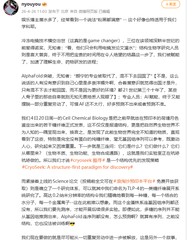 4月26日,颜宁院士通过个人微博发文称: