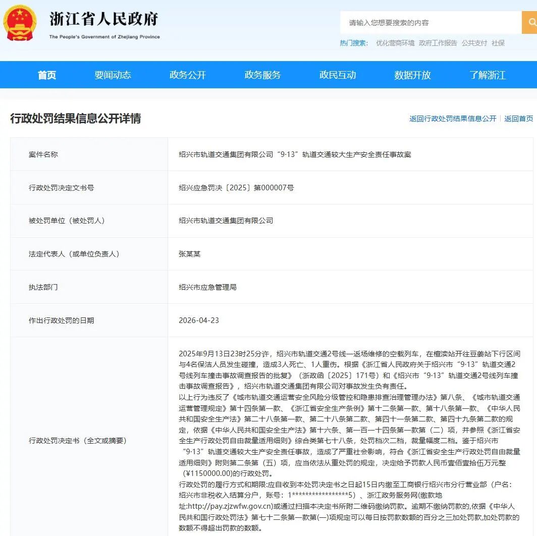 近日,浙江省人民政府“行政处罚结果信息公开”栏公示了绍兴市轨道交通集团有限公司(下称“绍兴轨道交通集团”)“9·13”轨道交通较大生产安全责任事故案的行政处罚结果。