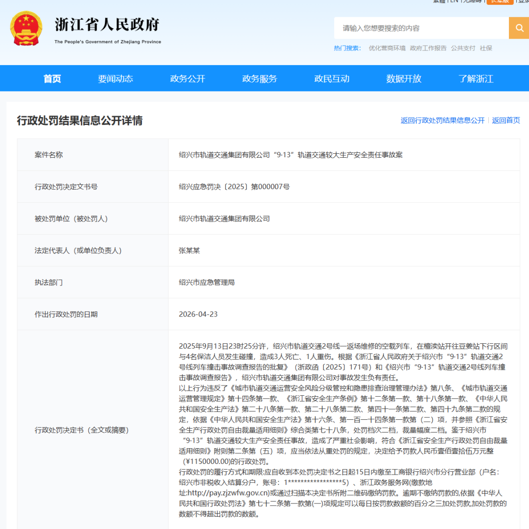 近日,浙江省人民政府“行政处罚结果信息公开”栏公示了绍兴市轨道交通集团有限公司“9.13”轨道交通较大生产安全责任事故案的行政处罚结果,全文如下: