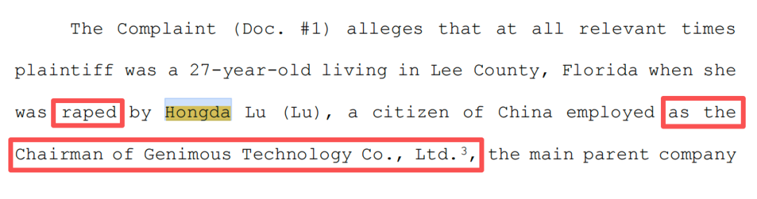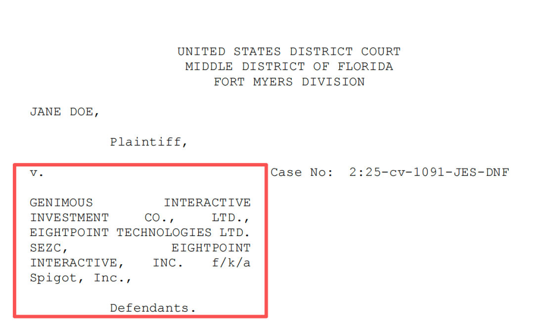 据美国佛罗里达州中区地方法院官网,一份签署日期为2026年2月的裁判文书显示,原告Jane Doe于2025年11月提起诉讼,起诉Genimous Interactive Investment Co., Ltd.(以下简称“Genimous Interactive”)、Eightpoint Technologies Ltd. SEZC(以下简称“Eightpoint”)以及 Eightpoint Interactive, Inc.(原名 Spigot, Inc.,以下简称“Spigot”)(下称“被告”),并就2023年12月9日在佛罗里达州迈尔斯堡发生的一起性侵(sexual battery)事件提出过失及替代责任主张。