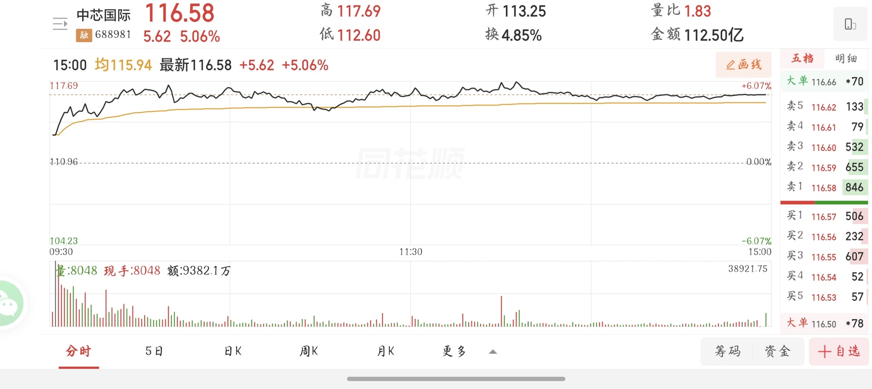 盘面上,赛道内个股行情火热,帝奥微、欧莱新材走出“20cm涨停”,芯源微大幅冲高,长川科技股价再创历史新高。作为行业权重龙头,约6000亿市值的中芯国际表现尤为亮眼,A+H股同步走强,单日涨幅超5%,整个芯片板块迎来普涨行情。