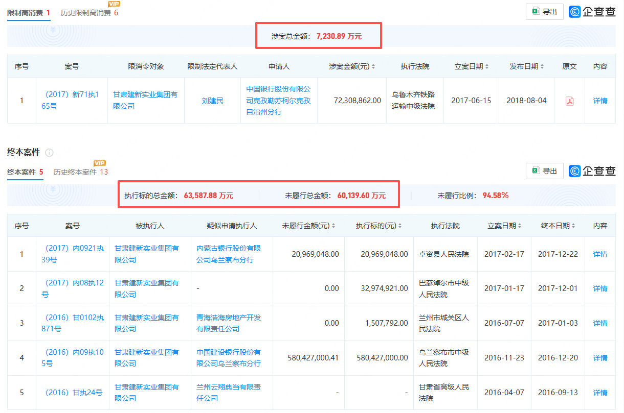 企查查信息显示,本次减持主体建新集团成立于1998年,注册地为甘肃省陇南市徽县,注册资本5.5亿元,法定代表人、董事长为吴城。该公司目前存在一条限制高消费记录,涉案金额7230.89万元,另有5条终本案件信息,未履行总金额达6.01亿元。